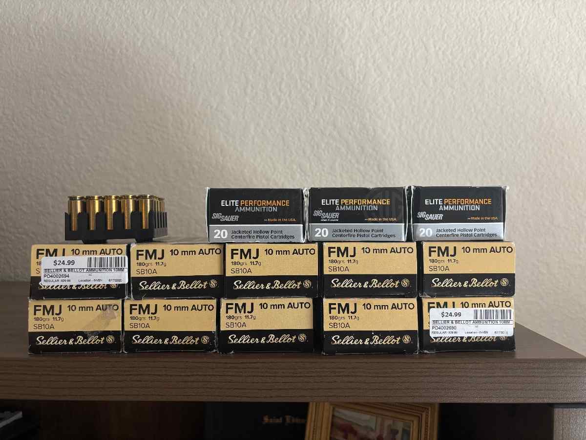 I have a lot of factory new 10mm ammo for sale. Included is 575 rounds of S&B and 60 rounds of Sig Sauer defensive hollow points. Will trade for factory new 45 ACP or 9mm or Ruger wrangler. Cash is king.