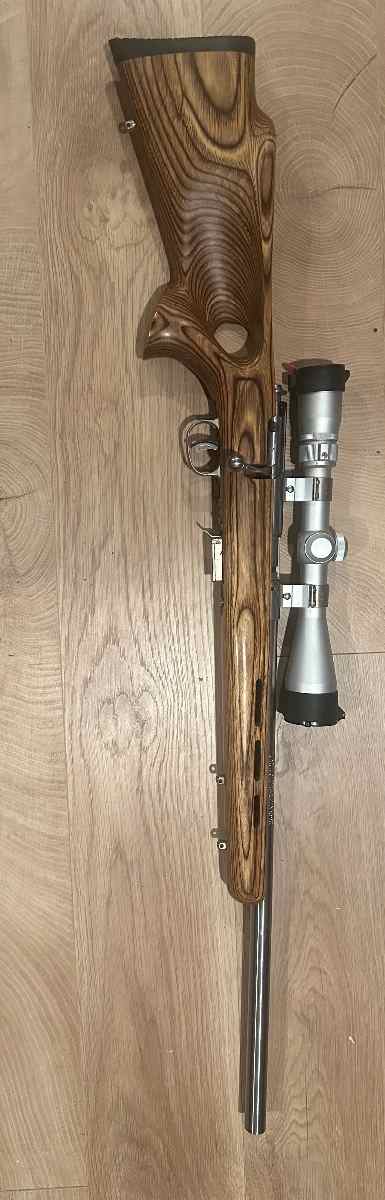 17hmr with thumbhole stock, bull barrel, Nikon 3x9 scope and accu trigger